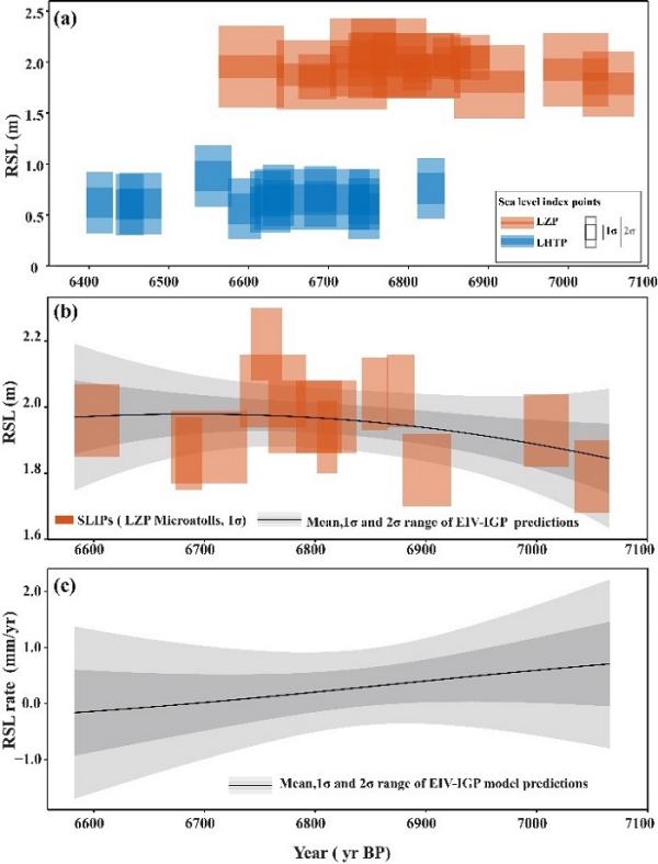 研究表明,在距今约6800年至6400年前,南海北部的相对海平面,稳定维持在现代平均海平面以上0.56–0.88 ± 0.34m (2σ),其百年尺度的变化速率仅为−0.13 ± 1.20 mm/yr(2σ),未表现出明显波动。这一“海平面稳定期”,与劳伦泰德冰盖在约7000年前基本停止融水输入的假说高度一致,为冰盖消融终止时间提供了年代学约束。