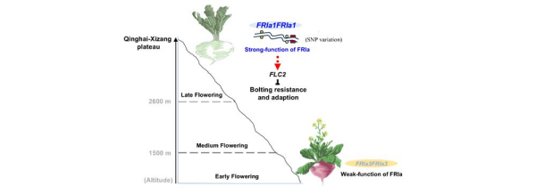 研究结果揭示了蔓菁开花时间沿海拔梯度的适应机制,为阐明FRIa如何促进蔓菁在不同海拔条件下适时开花提供了新见解,也为蔓菁FRIa强功能变异驱动海拔梯度下的开花时间适应性演化提供了分子基础。