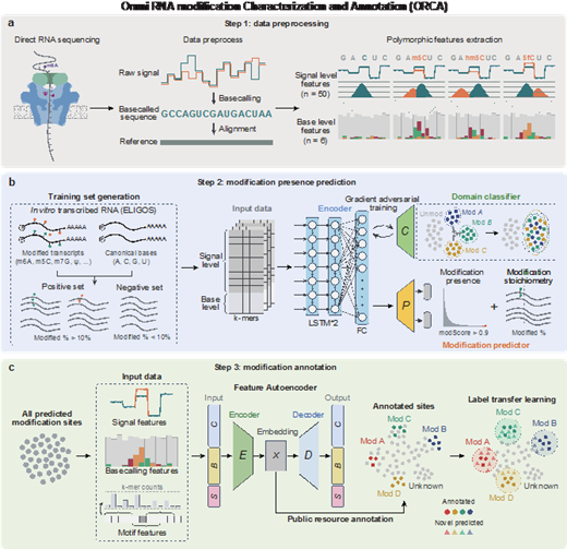 研究团队通过信号多态性特征提取与域对抗学习策略,克服了RNA修饰检测对特定修饰类型训练集的依赖问题。同时,算法ORCA利用RNA修饰在转录本上的“不完全性”,提取了修饰与未修饰RNA分子在同个碱基上产生的信号多态性特征,并结合域对抗学习策略,使模型能够选择性学习不同修饰类型间的共性特征。基于该策略,该算法仅需使用6种体外转录合成的RNA修饰数据集进行训练,即可在mRNA和核糖体RNA中,对超15种修饰类型进行系统识别与化学计量比预测,拓展了现有DRS数据中可解析的RNA修饰类型范围。
