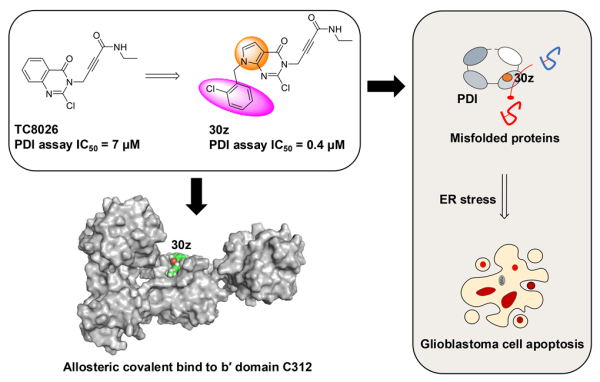 蛋白二硫键异构酶(PDI)在多种肿瘤中高表达,尤其在胶质母细胞瘤中与肿瘤细胞的生存、侵袭和耐药密切相关,因此被认为是有潜力的抗肿瘤治疗靶点。