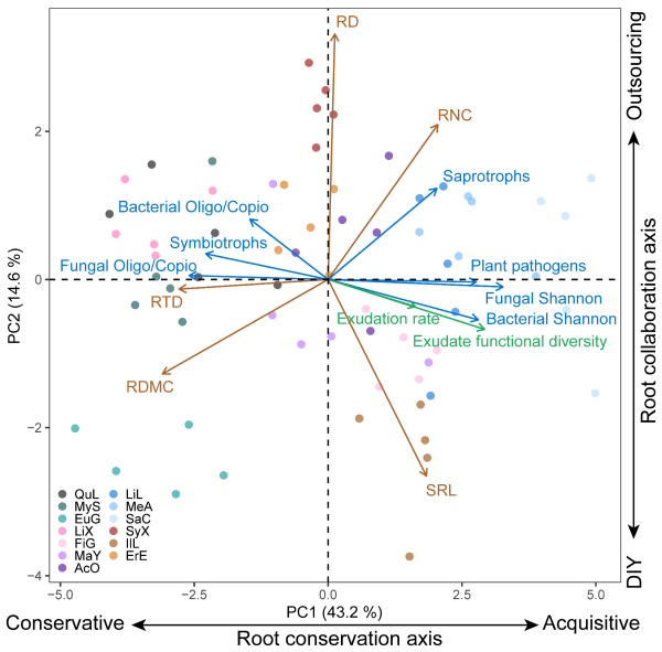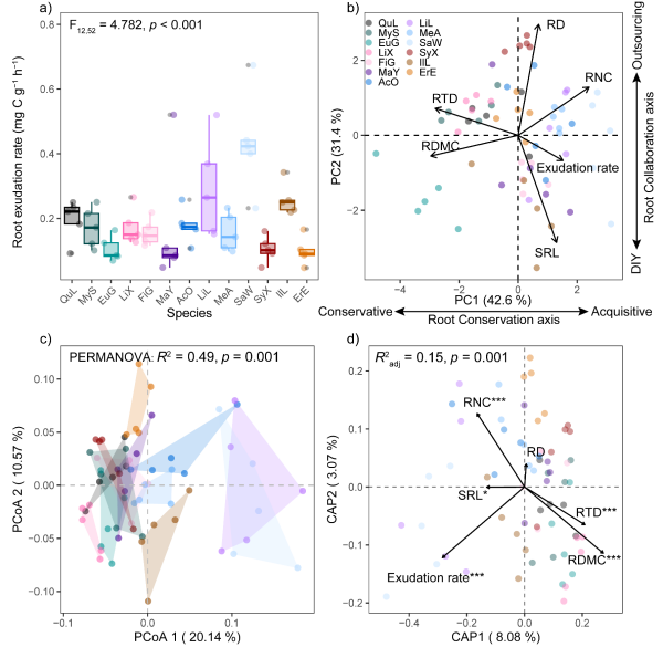 无码影片 成都生物研究所研究团队,以西藏墨脱亚热带森林中13种优势共存树种为对象,综合分析了各树种细根功能性状、分泌物分泌速率与代谢组成以及根际微生物功能特征,系统辨识了根系分泌物速率和组成在根系经济空间框架中的功能定位,及其在串联根系—微生物功能耦合中的核心作用。