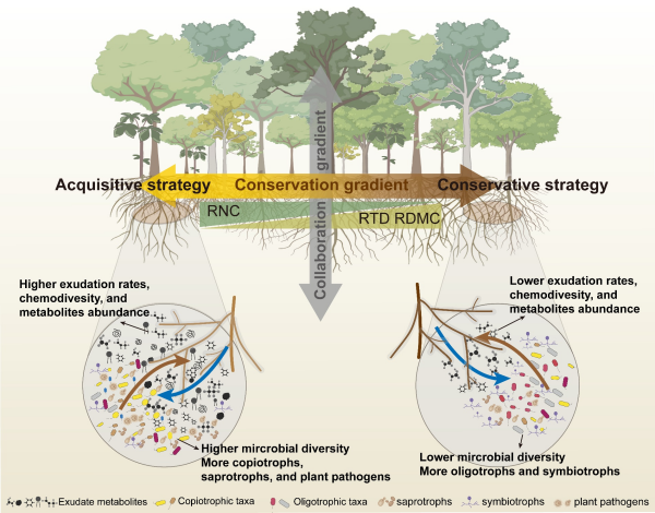 研究发现,沿根系资源“获取型—保守型”梯度,不同树种的根系分泌速率与化学组成呈现出显著的协同变化。随着树种策略从保守型向获取型转变,树木的根系分泌速率增加,其化学组成多样性也更为丰富。这种兼具“高通量—多样化”的根系分泌策略进一步招募了富营养型、快速生长微生物类群的聚集,从而构建起根系策略与根际微生物功能密切耦合的代谢桥梁。