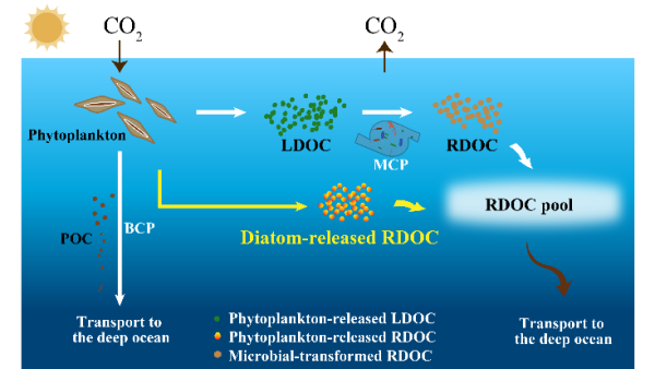 浮游植物是海洋碳汇的重要驱动者,其碳汇作用长期被认为依赖两条经典途径:一是生物碳泵,将光合作用固定的碳转化为颗粒有机碳,输送到深海后长期封存;二是浮游植物释放的活性溶解有机碳,经微生物转化为惰性溶解有机碳(RDOC)后在海水中长期留存。浮游植物能否不经微生物介导直接产生RDOC这一关键科学问题长期悬而未决。