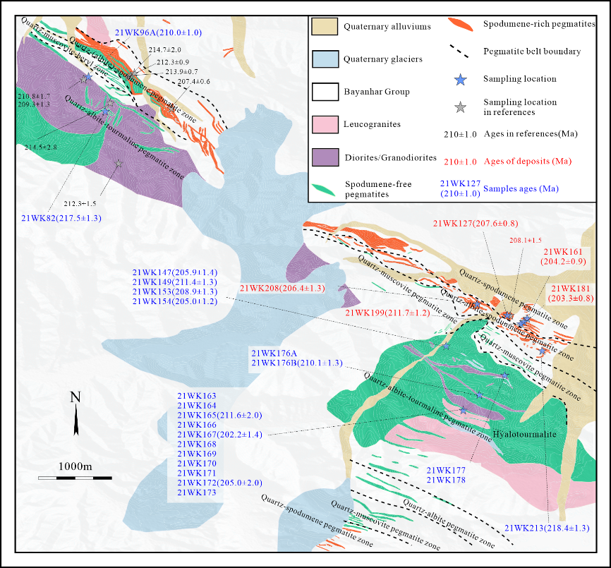 研究显示,白龙山岩浆—成矿事件集中于晚三叠世至早侏罗世早期:闪长岩形成于218Ma至210Ma、花岗闪长岩形成于212Ma至205Ma、淡色花岗岩形成于215Ma至196Ma、富锂辉石伟晶岩形成于约214Ma至195Ma、无锂辉石伟晶岩形成于218Ma至196Ma。这一结果表明,含矿伟晶岩、不含矿伟晶岩与不同岩性的侵入体在形成时代几乎重合。