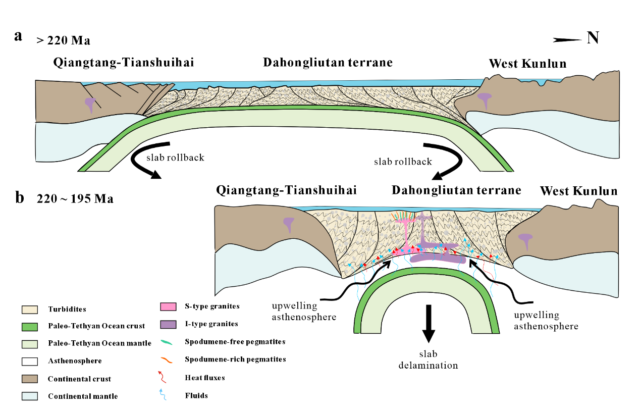 研究认为,白龙山晚三叠世I型与S型花岗岩及伟晶岩的同期形成,与古特提斯洋双向俯冲末期的板片回撤及最终拆沉过程相关。该过程可驱动软流圈上涌、形成富水基性岩浆,并向上提供热量与挥发份,进而诱发增生楔变浊积岩注水熔融,形成淡色花岗岩质熔体。该熔体聚集上升后,侵入早于其形成的晚三叠世海相沉积浊积岩,进而形成岩浆房,并在岩浆房冷却、结晶及固结的晚期阶段,通过抽提出富Li熔体,最终形成全脉矿化的富锂辉石伟晶岩。