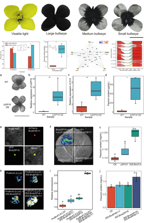 在较大紫外靶心的植株中,bZIP16基因存在显著的选择性清除信号,表明较大的紫外靶心大小受到了强烈的正向选择。在甘蓝型油菜中过表达bZIP16后,花内黄酮醇的含量显著增加。结合拟南芥紫外靶心的研究结果,团队通过烟草注射进一步证明BrobZIP16通过与BroMYB111互作调控了BroFLS的表达,进而调节了黄酮醇的合成。
