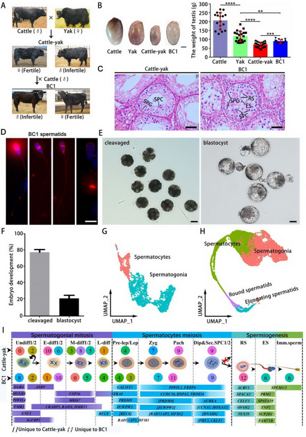 研究团队系统绘制了普通牛、牦牛、普通牛与牦牛的杂交F1代(犏牛)和回交一代(BC1)睾丸细胞各生精阶段生殖细胞及体细胞的转录特征图谱。结果发现,普通牛和牦牛睾丸中存在7种精原细胞、10种精母细胞和11种精子细胞亚型,而犏牛睾丸中仅鉴定出7种精原细胞和6种初级精母细胞亚型,表明其生精过程存在严重阻滞。犏牛精母细胞在减数分裂I前期的双线期到终变期停滞,并伴随DNA双链断裂修复缺陷及性小体形成受损。相比之下,回交一代睾丸中出现了圆形和少量长形精子,生精阻滞得到缓解,且其长形精子经显微授精后可支持胚胎发育。