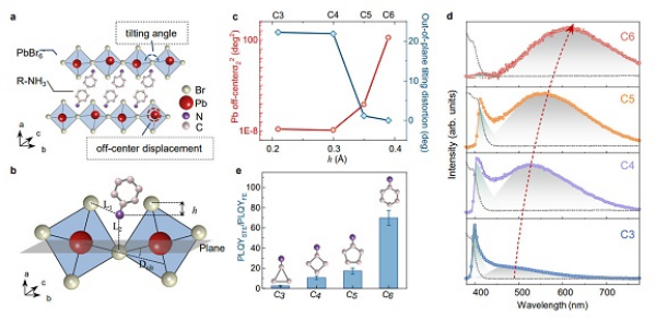 研究团队创新性地选取了一系列具有相同结构类型、不同环尺寸环状有机阳离子的二维溴化铅钙钛矿作为研究对象,通过精准调控有机阳离子的空间位阻效应,系统探究结构畸变对发光性能的影响。研究发现,随着环状有机阳离子环尺寸的增大,由于电子—声子耦合强度的增强,自陷激子发射强度显著提高。