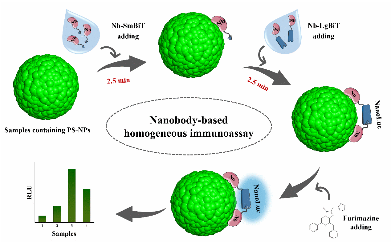 无码影片 青岛生物能源与过程研究所研究团队,依托筛选获得的高亲和力聚苯乙烯结合纳米抗体B2,构建了融合分裂型纳米荧光素酶亚基(SmBiT/LgBiT)的双功能探针,开发出一种基于纳米抗体与分裂荧光素酶技术的均相免疫分析方法,实现对20纳米聚苯乙烯纳米塑料的高灵敏、快速定量检测。