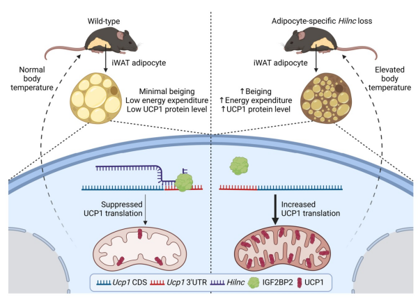 该研究解析了Hilnc抑制翻译的分子细节。当破坏Hilnc中与Ucp1 mRNA结合的关键区域后,IGF2BP2无法被有效招募至Ucp1 mRNA,其翻译抑制效应也随之解除。这种不依赖于mRNA降解的翻译抑制模式,类似于微小RNA的作用,但由lncRNA介导,揭示了新的转录后调控范式。Hilnc在棕色脂肪和不同的白色脂肪库中表达模式存在差异,其特异性调控米色脂肪细胞中UCP1的翻译,提示棕色与米色脂肪细胞尽管功能相似,但可能受到不同的转录后调控网络支配,这为理解全身产热调控的复杂性提供了新视角。