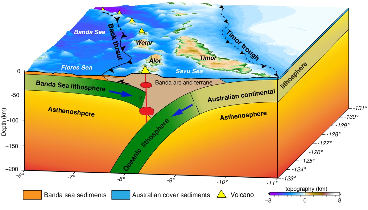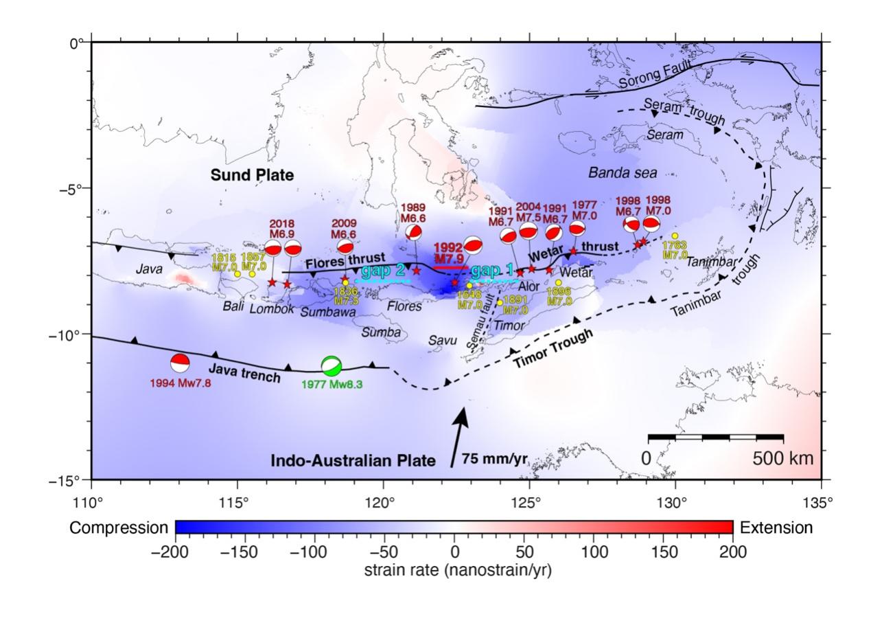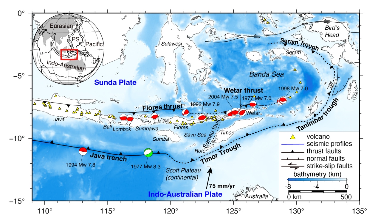 研究结果表明,弧后弗洛勒斯—韦塔反冲断裂与弧前帝汶海槽,共同吸收了印—澳板块与巽他板块约75 mm/yr的汇聚速率。其中,弗洛勒斯—韦塔断裂滑动速率为7.6mm/yr至23.9mm/yr,是区域大多数强震(MW6.6)的发震构造,包括1992年MW7.9弗洛勒斯地震及其引发的海啸灾害。帝汶海槽滑动速率为13.3mm/yr至30.7mm/yr,但近百年来仪器观测未记录到强震活动,地表及浅部构造活动迹象相对较弱。