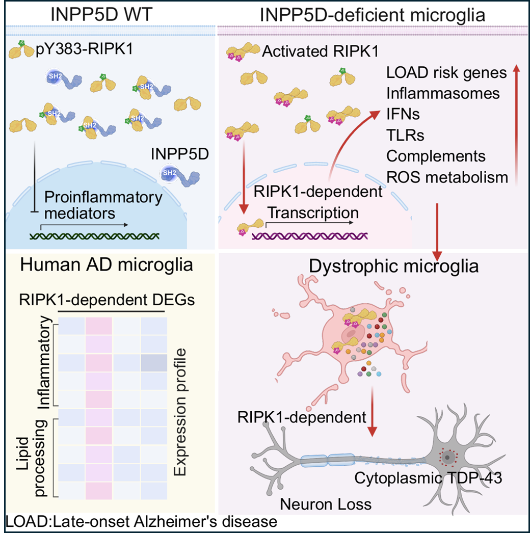 研究证实,INPP5D可借助其SH2结构域与RIPK1直接结合,进而有效抑制RIPK1过度激活,维持细胞内稳态平衡。当小胶质细胞中INPP5D缺失时,RIPK1会发生异常激活,进而触发连锁有害反应:一方面致使炎症因子、补体因子及氧化应激调节因子的产生调控失控,诱发过度神经炎症;另一方面会异常激活多种阿尔茨海默病相关风险基因,加速疾病的发生发展进程。