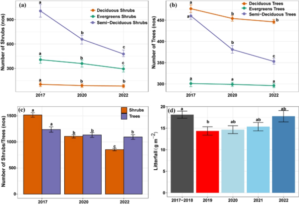 不同年份乔木或灌木的数量和凋落物的数量有显著差异
