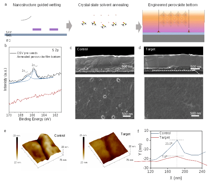CSV纳米晶具有各向异性棒状形貌,可改善疏水SAM表面的浸润性,促使钙钛矿前驱体溶液均匀铺展。在结晶过程中,这些纳米晶作为异相成核位点,加速钙钛矿生长。同时,其结构中锁定的DMSO分子在热退火时可控释放,形成“晶格约束溶剂退火”环境,在薄膜底部提供温和溶剂氛围,促进晶粒重组与生长。这一机制结合晶种诱导,有效消除了界面孔洞、平滑了晶界凹槽,获得了致密且取向更优的底部晶体结构。