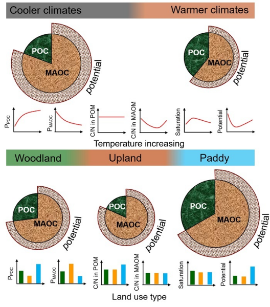 结果发现,土壤总有机碳含量以南方(亚热带和热带)低于北方(中温带和暖温带),且每个气候带总体表现为稻田>林地>旱地。所有土壤有机碳库组成均以MAOC(60%~77%)为主,但南方土壤MAOC对总有机碳的贡献(58%)低于北方(69%)。农业土地利用重塑了土壤有机碳库组成及其稳定性。