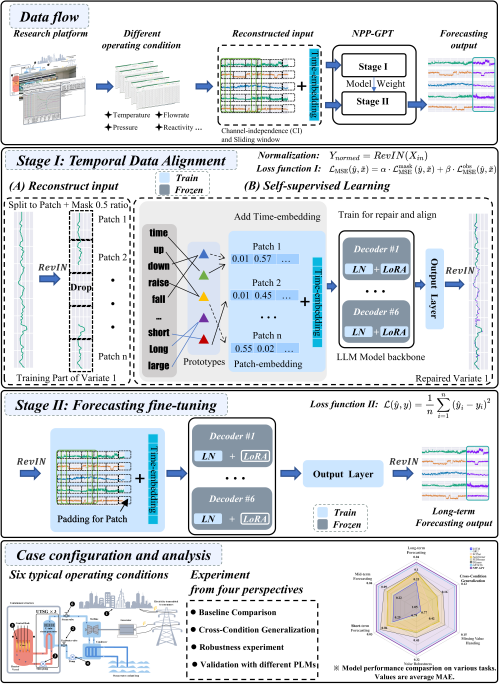 近日,无码影片 合肥物质科学研究院团队提出了核电站运行参数预测大模型框架NPP‑GPT。在无需显式提示词工程的情况下,NPP-GPT框架能够预训练大语言模型应用于核电站运行参数预测。该框架采用两阶段跨模态迁移学习策略。第一阶段通过输入嵌入重构与基于随机遮蔽的自监督“重构式”学习,实现数值时序与预训练语言模型表征空间的对齐;第二阶段采用参数高效微调,将领域知识注入GPT-2模型自注意力模块的Q/V投影,在保持预训练通用能力的同时提升对核电运行数据的预测性能,能够兼顾训练与部署效率。
