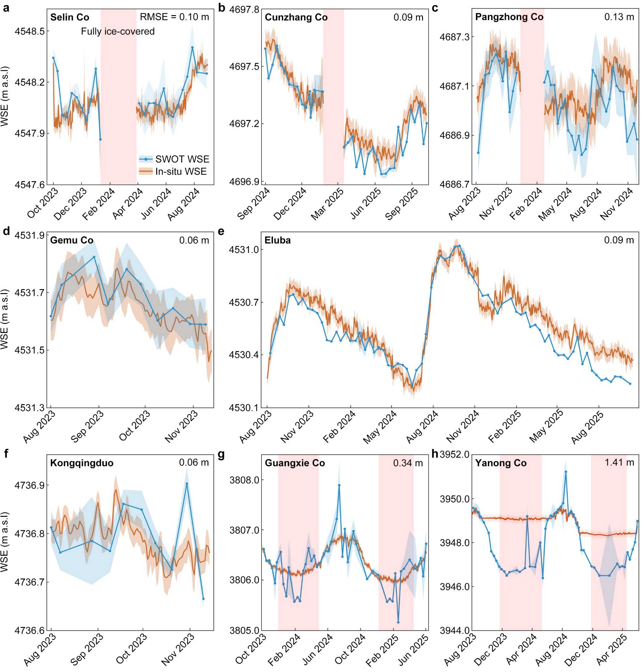 青藏高原分布有六万余个湖泊,因受人类活动干扰较少,这些湖泊是监测气候变化的理想“前哨”。然而,传统星载高度计受轨道稀疏、采样间距较大、在小型湖泊上易受信号污染等因素限制,难以实现对高山小型湖泊水位的有效监测。2022年发射的地表水与海洋地形(SWOT)宽幅高度计卫星,凭借高空间分辨率、短重访周期及全面覆盖等优势,为水体变化监测提供了新的技术途径。但在高山复杂地形条件下,其载荷设计易引发更为显著的信号污染,导致小型湖泊水位测量误差偏大、数据可用性降低。目前,学界尚缺乏针对SWOT卫星在青藏高原地区实际监测能力的系统性探索与评估。