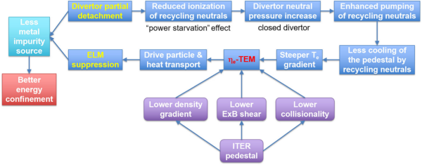 这项研究发现了高性能集成运行模式并阐明了背后的物理机制。偏滤器部分脱靶结合封闭偏滤器位形,可提升台基温度梯度,激发温度梯度驱动的捕获电子模湍流。这种湍流在台基区形成稳定向外的粒子和热输运通道,从而限制台基压力增长,在抑制边缘局域模的同时维持了高性能。同时,这一物理过程由温度梯度、密度梯度和碰撞率等物理参数主导。ITER装置的台基预计具有更低的密度梯度、更弱的E×B流剪切以及更低的碰撞率,这些条件将更利于激发脱靶—湍流主导台基模式中的捕获电子模湍流。