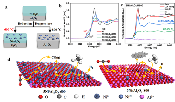 团队以Ni/γ-Al2O3为模型催化剂,通过调控还原温度构建了Ni0/NiAl2O4/Al2O3界面和Ni0/Al2O3界面,并借助原位XPS、原位XANES确定了两种界面中Ni0比例。反应评价测试验证了两种界面结构的性能差异。团队明确了Ni0/NiAl2O4/Al2O3界面结构的抗积炭反应机理,发现碳酸氢盐(HCO3*)和碳酸盐(CO3*)是CH4抗积炭反应路径中的关键中间体。
