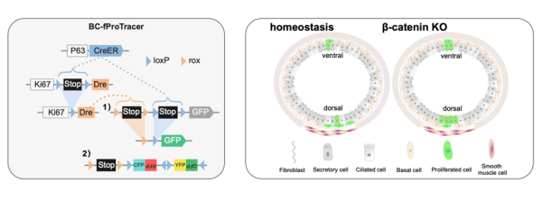 研究发现,经典的WNT信号通路维持基底细胞的对称分裂模式,以维持气管中的干细胞库,而破坏这一信号通路使得干细胞命运更多地通过增殖分化转变为杯状细胞或纤毛细胞。此外,该工作补充了气管基底细胞异质性的研究,证明了Hillock并不是气管中唯一的稳态与损伤下的干细胞库,并提供了气管基底细胞至少存在两个亚群的直接在体证据。