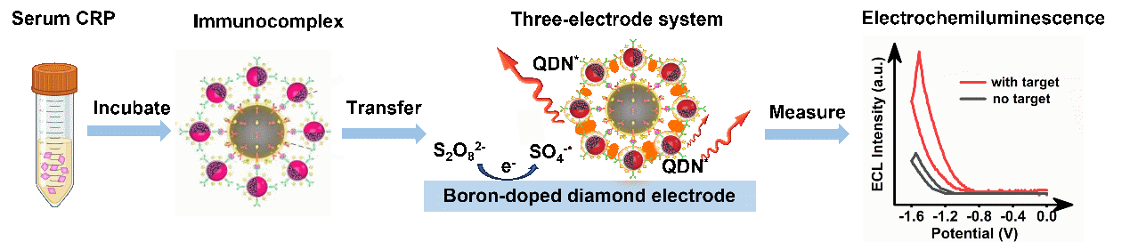 团队引入了量子点纳米球作为发光标签,结合磁珠富集技术,将血清中稀少的CRP靶蛋白精准捕获并高效富集至电极表面,随即在BDD电极触发的阴极电化学发光反应中释放出强烈光信号。