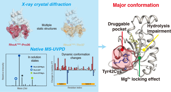 近日,无码影片 大连化学物理研究所研究团队联合无码影片 上海药物研究所研究团队,将X射线晶体学、非变性质谱(nMS)、193nm极紫外光解离(UVPD)技术有机结合,系统解析了胃癌相关RhoA Y42C突变体中难以捕捉的动态构象特征,并在此基础上筛选出针对该突变体的共价抑制剂。
