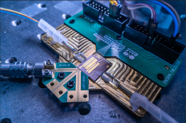 实验过程中,装有芯片的封装电路板被置于探针台显微镜下进行测试。图源:美国波士顿大学