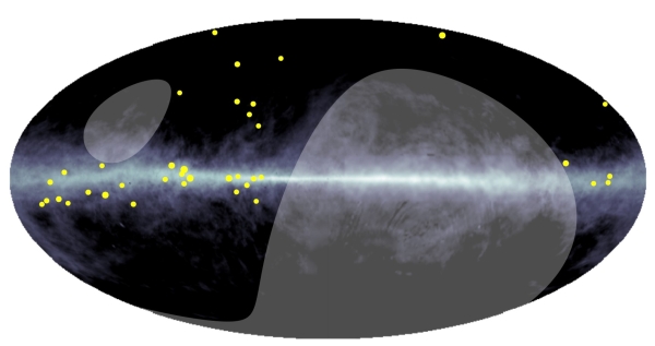 西藏ASγ实验团队观测到的超高能弥散伽马射线事例在银道坐标系下的分布。这些超高能弥散伽马射线的能量在400TeV到1PeV之间,表现出向银盘(图中水平中线)集中分布的特点。灰色阴影区域是ASγ实验无法观测的区域。背景色轮廓显示了银河系坐标中氢原子的分布。