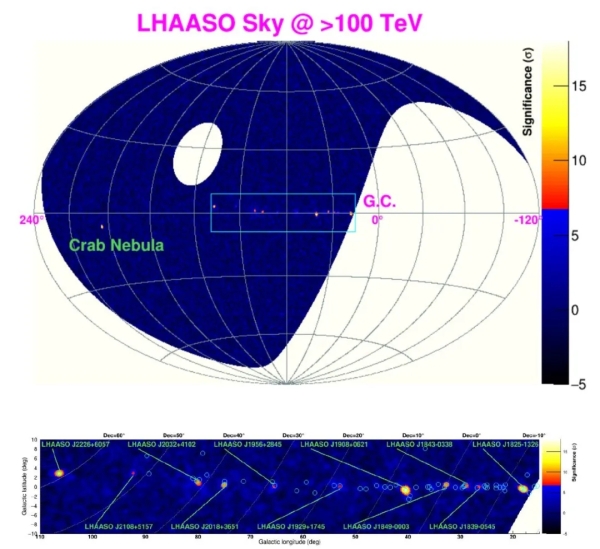 KM2A测得的超高能伽马源天图(上)及银道面局部放大图(下)