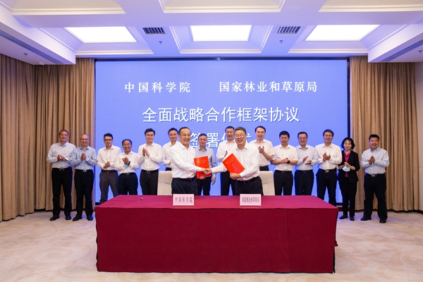 中科院副院长张涛与国家林草局副局长彭有冬代表双方签署协议。根据协议,双方将按照“开放联合、优势互补、协同创新、合作共赢”的原则,聚焦国家生态安全、乡村振兴等重大战略需求,开展林草科技创新战略研究,共同部署实施以国家公园为主体的自然保护地体系建设、国家植物园创新体系建设、野生珍稀濒危动植物保护等重大创新研究任务,支撑我国重大生态工程建设。