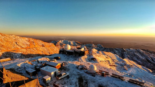 2020年冬季赛什腾雪后的夕照,整个天文观测基地笼罩在落日余晖中,远处是辽阔的柴达木盆地。