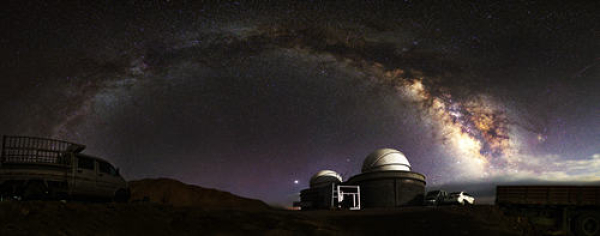 2021年“七夕”的银河拱门,拍摄于施工中的赛什腾C点,中国科学技术大学的2.5米巡天望远镜、中科院国家天文台的1米SONG望远镜、西华师范大学的50BiN双筒望远镜、中科院地质与地球物理研究所的1.8米和80厘米行星观测望远镜均建于这个平台。