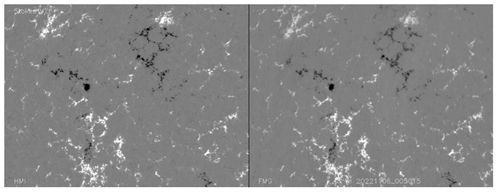 图2. FMG观测到的2022年11月6日00:50:15UT局部纵向磁图(右边)与同一时间美国HMI/SDO观测结果(左边)的对比