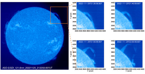 工作在莱曼阿尔法波段的莱曼阿尔法太阳望远镜(LST)的子载荷——太阳日面成像仪(SDI),自开机以来已观测到多个耀斑及日珥。图5展示了SDI/LST于11月25日观测到的一个爆发日珥。