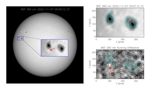 图6. WST/LST在11月7日观测到1个白光耀斑,右边红色等值线为连续谱增强位置相对黑子的位置