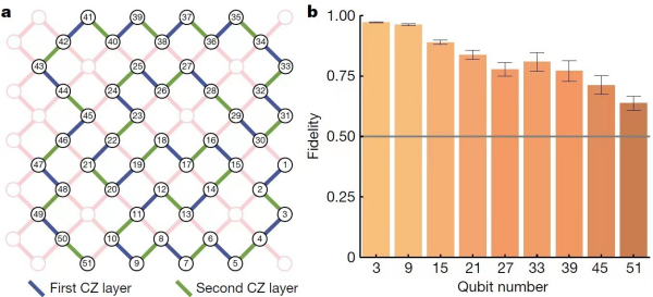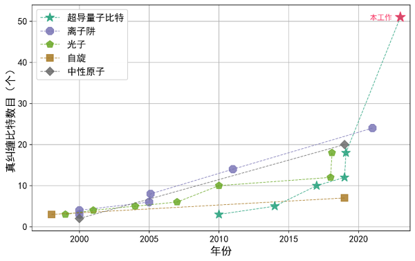 然而,更大规模的真纠缠态制备要求高连通性的量子系统、高保真的多比特量子门以及高效准确的量子态保真度表征手段。高连通性保证了大规模量子态生成的可能性,避免因缺陷和连通性不足限制量子态规模;通过高保真量子门才能够将量子比特连接起来形成高保真的多体量子纠缠态;而高效的量子态表征是克服随比特数指数级增长的量子态规模复杂度、进行量子态保真度准确估计的重要保证。由于难以实现对量子系统性能、操控能力以及验证手段的这些要求,此前真纠缠比特的规模未能突破24个量子比特。