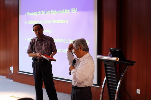 第十六次院士大会期间访问了国家纳米科学中心,并为中心的师生作了一场风趣生动的讲座。在讲座中,饭岛澄男院士介绍了他近半个世纪的科研路程,并结合自己的亲身经历给中国的科研工作者提出了很多宝贵的意见。
