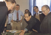 1986年,陪同杨振宁(右)参观北京正负电子对撞机模型,左一为叶铭汉