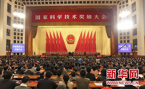 中共中央、国务院2月14日上午在北京隆重举行国家科学技术奖励大会。党和国家领导人胡锦涛、温家宝、李长春、李克强出席大会并为获奖代表颁奖。温家宝代表党中央、国务院在大会上讲话。李克强主持大会。