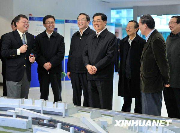 1月14日至17日,中共中央总书记、国家主席、中央军委主席胡锦涛在上海市考察工作。这是胡锦涛在上海同步辐射光源工程考察时,详细了解这一工程的建设、运行和为科学实验提供服务的情况。新华社发