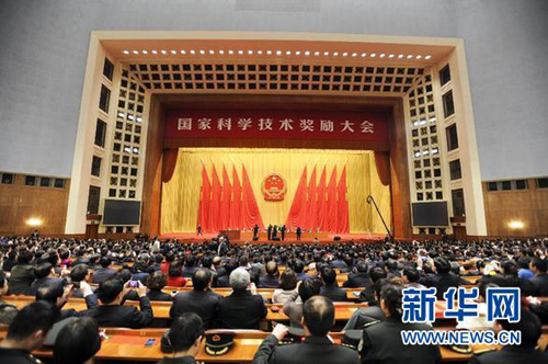 中共中央、国务院1月18日上午在人民大会堂隆重举行国家科学技术奖励大会。胡锦涛、习近平、温家宝、李克强、刘云山出席大会并为获奖代表颁奖。