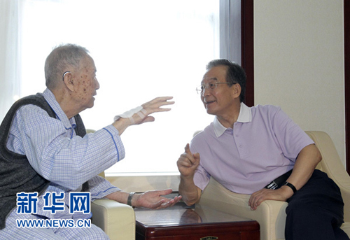 9月4日,中共中央政治局常委、国务院总理温家宝利用周末时间,登门看望三位著名的科学家、国家最高科技奖获得者叶笃正、师昌绪和王忠诚。这是在师昌绪家中温家宝与师昌绪夫妇交谈。新华社记者丁林摄
