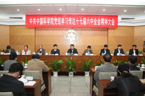 院长、党组书记白春礼,副院长、党组成员詹文龙分别传达了十七届六中全会有关精神,白春礼代表院党组就中科院学习贯彻六中全会精神提出了要求,党组副书记方新主持会议。在京的院领导、副部级以上老领导,京区单位党员党政主要负责同志,院机关处长及以上干部、离退休党支部书记出席会议。