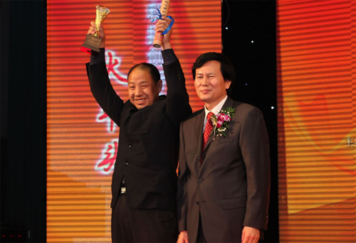 新华通讯社副社长庹震为工人师傅焦建民(左)颁发积极参与奖