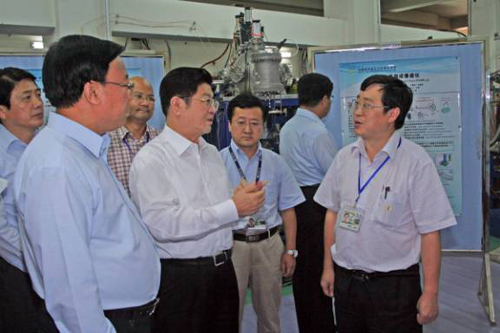 王兆国一行视察了SSC、320KV高压平台、重离子微束装置、重离子治癌装置、重离子冷却储存环主环和实验环等,并询问了自主创新、科技成果转化和产业化等情况。近物所所长肖国青汇报了相关情况。