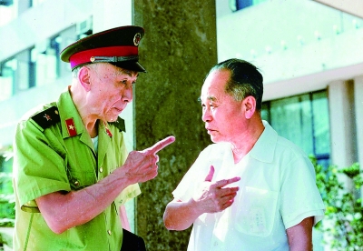 程开甲(右)与朱光亚(左)交谈。新华社发(总装备部供图)