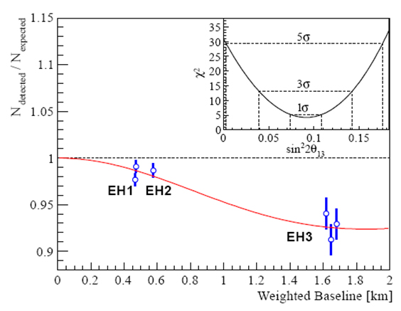 中微子是一种不带电,质量极其微小的基本粒子,共有三种类型,即电子中微子、μ中微子和τ中微子,在目前已知的构成物质世界的12种基本粒子中占了四分之一,在微观的粒子物理和宏观的宇宙起源及演化中同时扮演着极为重要的角色。中微子有一个特殊的性质,即它可以在飞行中从一种类型转变成另一种类型,通常称为中微子振荡。原则上三种中微子之间相互振荡,两两组合,应该有三种模式。其中两种模式自60年代起即有迹象,当时称作“太阳中微子之谜”和“大气中微子之谜”。1998年日本的超级神冈实验正式发现大气中微子振荡,随后太阳中微子振荡也被多个实验证实。第三种振荡则一直未被发现,甚至有理论预言其根本不存在(即其振荡几率为零)。