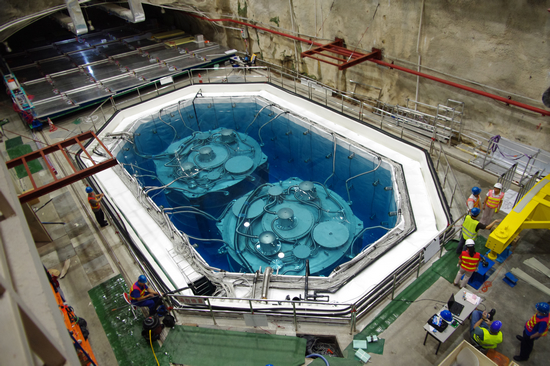 两个直径5米、高5米、重110吨的中微子探测器安装在巨型水池中