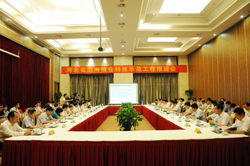 中科院科技促进发展局(筹)局长严庆在推进会上介绍了中科院在“渤海粮仓”工作中的布局。中科院以“扩面积、增单产、水保障”为核心,重点突破土、肥、水、种等关键技术,在环渤海低平原区的河北、山东、辽宁和天津等地建立粮食增产示范区,重点开展耐盐碱小麦玉米新品种选育、河北试区咸水利用关键技术研发升级、山东试区盐碱地改良新技术研发升级、区域适应性高效肥料研制与应用、农资物联网示范点建设等工作,为实现增产目标做出贡献。河北省农科院院长王慧军介绍了河北省“渤海粮仓科技示范工程”的最新进展情况。科技部农村司副司长郭志伟介绍了科技部对“渤海粮仓”项目的部署情况和项目实施中的具体要求。