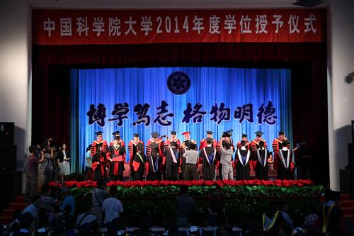 中科院副院长、国科大校长丁仲礼出席典礼并致辞。中科院副秘书长、国科大党委书记邓勇宣读2014年度学位授予决定。国科大副校长王艳芬主持典礼。 国科大学位评定委员会委员、学科群分会委员及导师代表等近20人共同为600余名毕业生代表授予学位并扶正流苏。